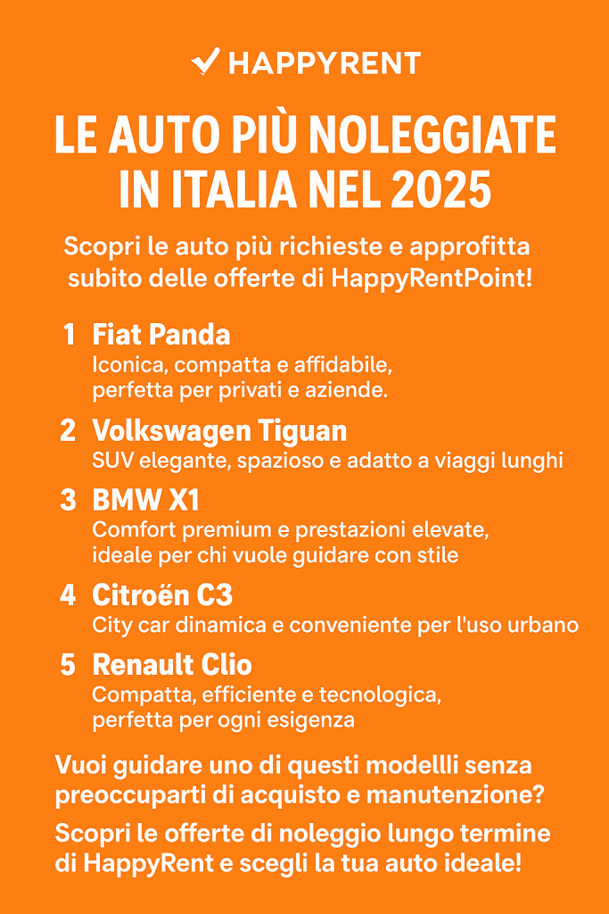 Scopri le auto più richieste e approfitta delle opportunità offerte dal noleggio lungo termine di HappyRentPoint.